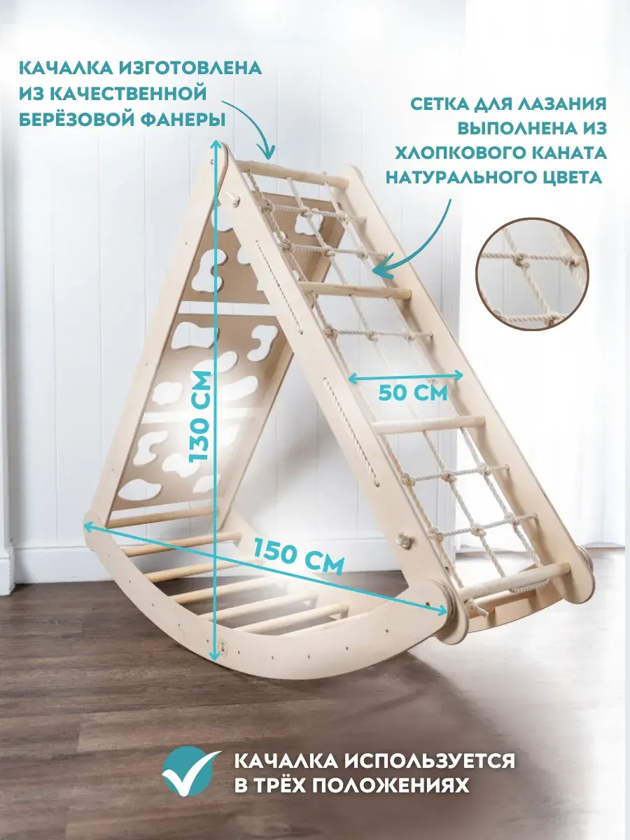 4. Качество и безопасность: Комплекс изготовлен из качественной берёзовой фанеры, деревянных перекладин и хлопкового каната. Все деревянные элементы прошли 4-х этапную шлифовку и покрыты безопасным для детей лаком на водной основе. Это гарантирует долговечность, безопасность и практичность использования. А возможность переворачивать конструкцию и использовать её как лестницу, скалодром или качалку делает игру ещё более увлекательной!